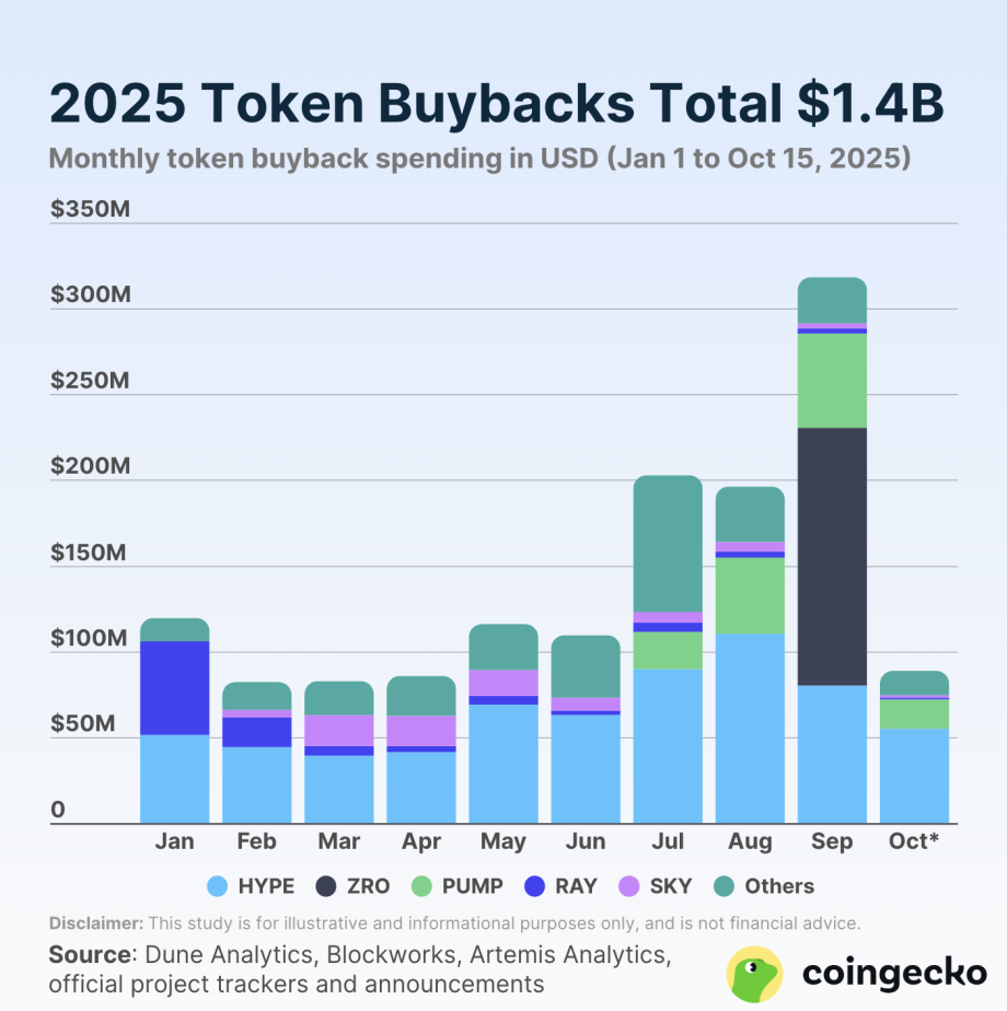Cryptocurrency projects have poured over $1.4 billion toward token buybacks in 2025, with just 10 projects capturing 92% of the total expenditure.