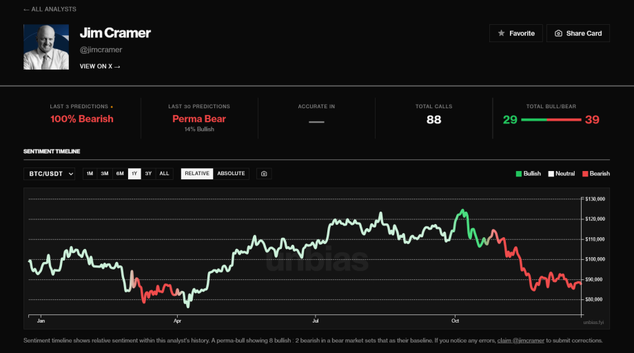 Data shows that Cramer’s last three Bitcoin predictions were all bearish, pushing his near-term outlook into what Unbias categorizes as “perma-bear” territory.