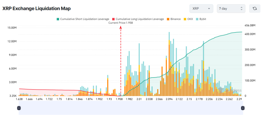 Liquidation data indicates that if XRP rebounds to $2.29 this week, Short positions could face more than $600 million in liquidations.