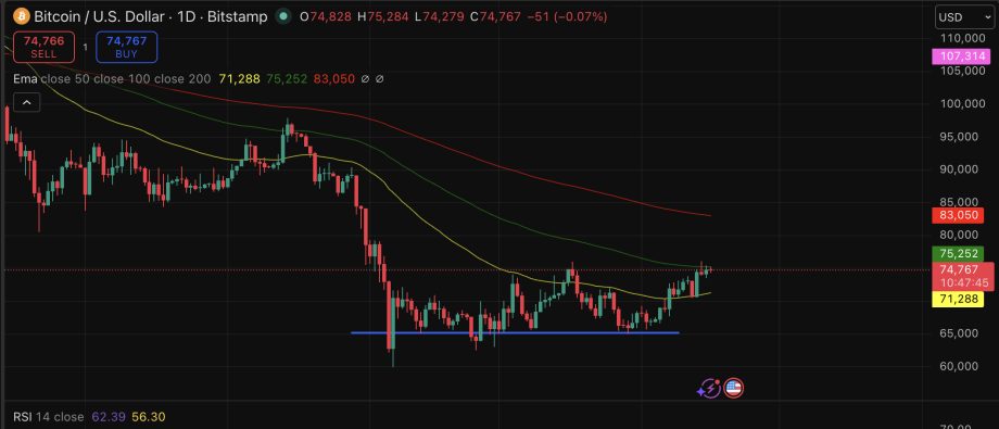 Bitcoin is consolidating just below $75,000, holding above the $71,000–$72,000 support band that served as a floor during earlier geopolitical volatility. Yesterday’s high of $76,000 represents immediate resistance.