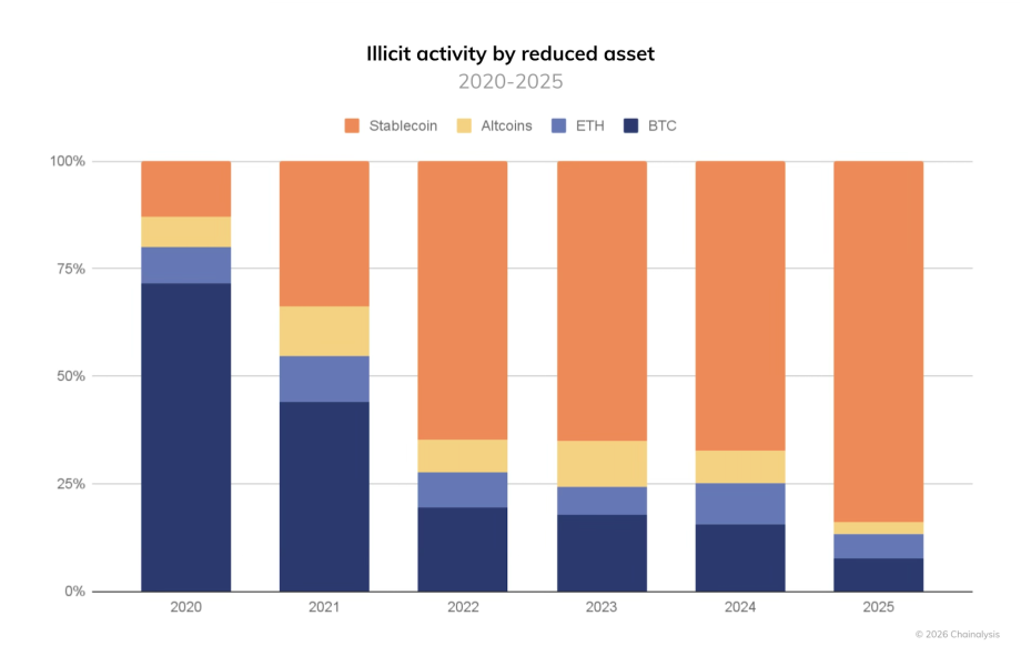Five years later, that pattern has reversed. In 2025, stablecoins represented 84% of all illicit transaction volume. Bitcoin’s use shrunk to just 7%.