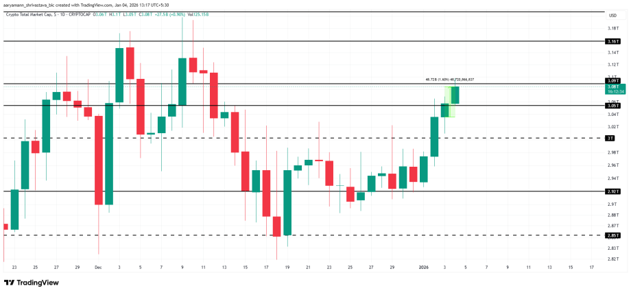 Near-term direction depends on global market reaction to the US attack on Venezuela over the weekend. A positive response could support risk assets. In that case, TOTAL may break above $3.09 trillion and extend gains toward the $3.16 trillion level.