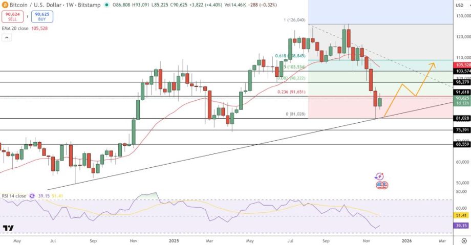 Bitcoin’s weekly chart shows the market attempting to stabilize after a three-week decline. Price has bounced from the $91,651 Fibonacci 0.236 level, producing a candle with a long lower wick, an early sign that selling pressure is easing.