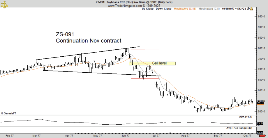 Brandt drew a direct historical comparison to justify his caution: “In 1977 Soybeans formed a broadening top and then declined 50% in value. Bitcoin today is forming a similar pattern.”