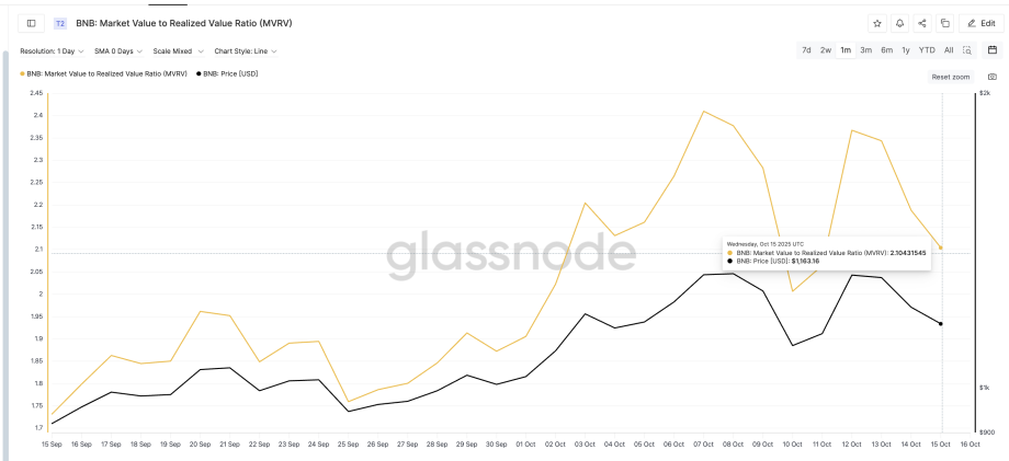 On October 7, when BNB’s price hit $1,300, the MVRV ratio peaked at 2.40, indicating stretched profit levels. A few days later, during the sharp drop from $1,300 to $1,100 (a 15.7% fall), the ratio bottomed around 2.00. It was a zone similar to the local low from October 4 and preceded a 15% rebound from $1,100 to near $1,300 in just two days.