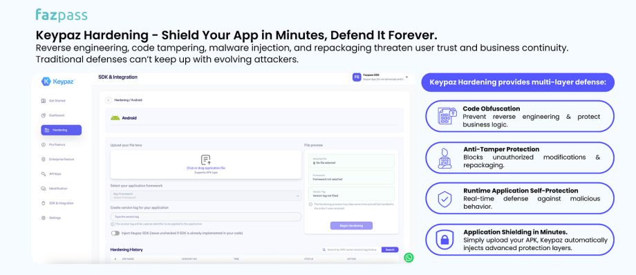 Keypaz Hardening makes reverse engineering, tampering, and malware a thing of the past. With instant multi-layer defense code obfuscation, anti-tamper, runtime self-protection, and one-click shielding you keep your app, your users, and your business safe. [Try Now!]